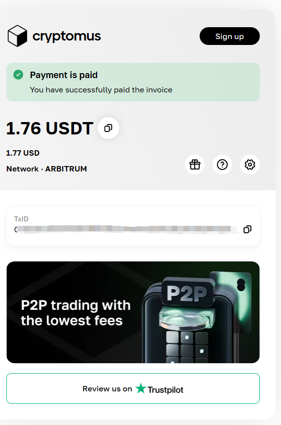 设置好链路后,点击 Proceed to the payment ,向这个地址转账对应数量的USDT,注意了交易所提币的时候扣减手续费,会从你填写的提币数量中扣减,必须保证到账数量是上面显示的数量,而不是扣除手续费的数量,比如我的是1.76 USDT