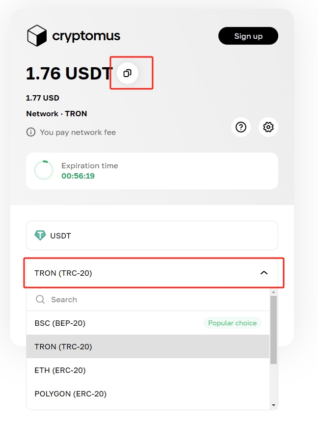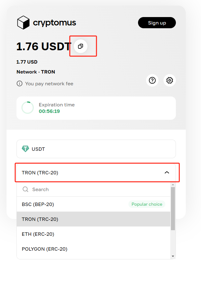 USDT付款选择此项是最便宜的,你也可以尝试其他的选择。